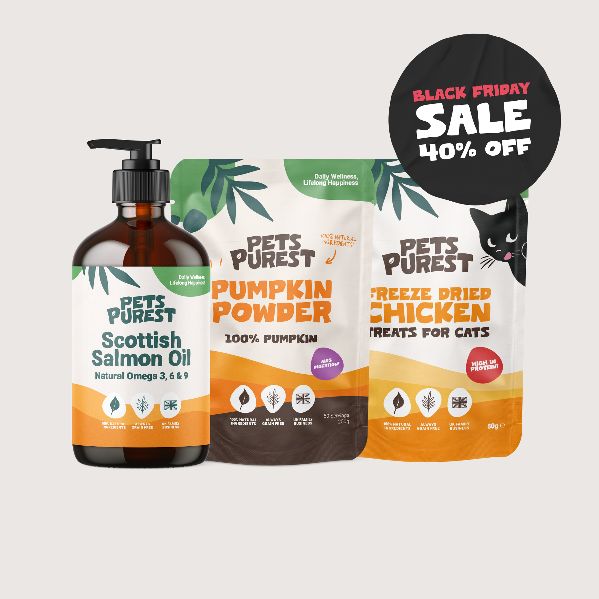 A wholesome wellness bundle for your cat's overall health and happiness. Includes three 100% natural essentials - Salmon Oil (300ml), Freeze-Dried Chicken Treats, and Pumpkin Powder.