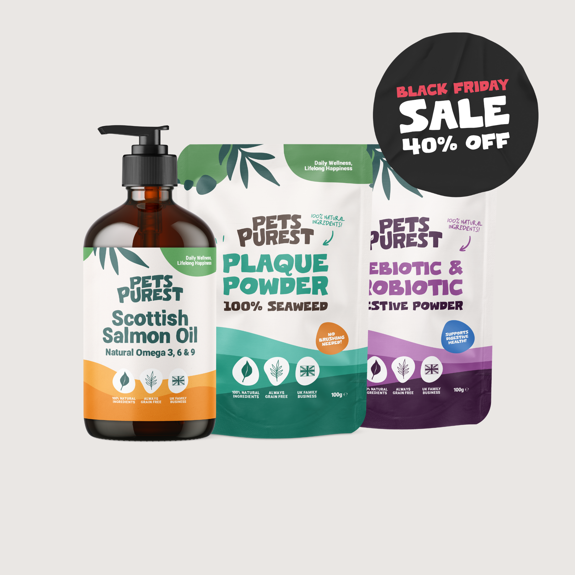 This bundle contains Natural Plaque Powder, Natural Scottish Salmon Oil, Pre & Probiotic Powder.