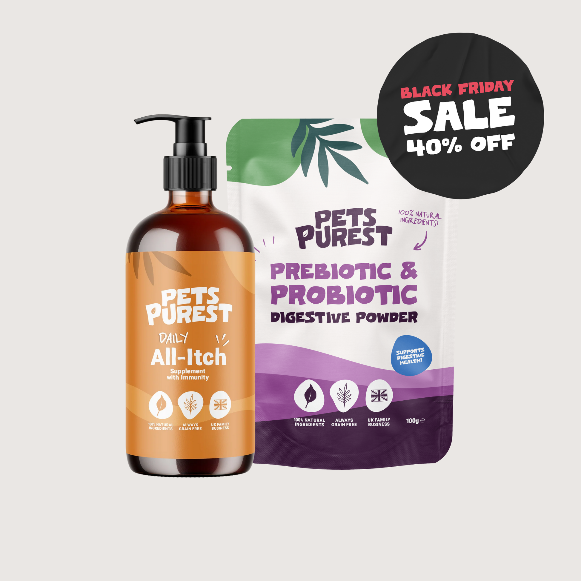Our Itchy Skin Duo is the perfect bundle to support your pet’s skin and overall wellbeing. It includes our Daily All-Itch Supplement and Pre & Probiotic Powder, working together to soothe irritated skin, reduce itching, and promote a balanced gut.