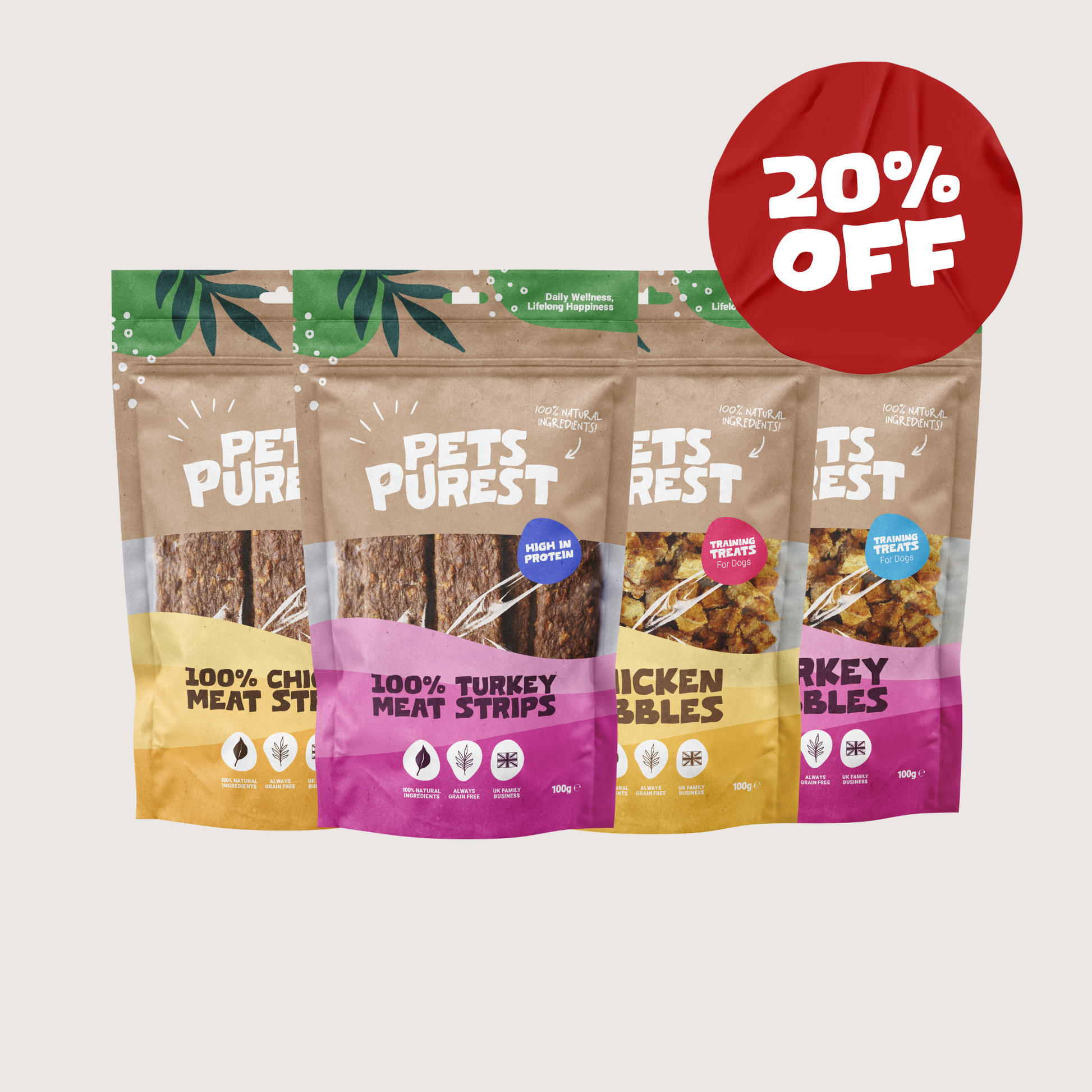 This bundle includes Chicken Meat Strips, Turkey Meat Strips, Chicken Nibbles, and Turkey Nibbles.