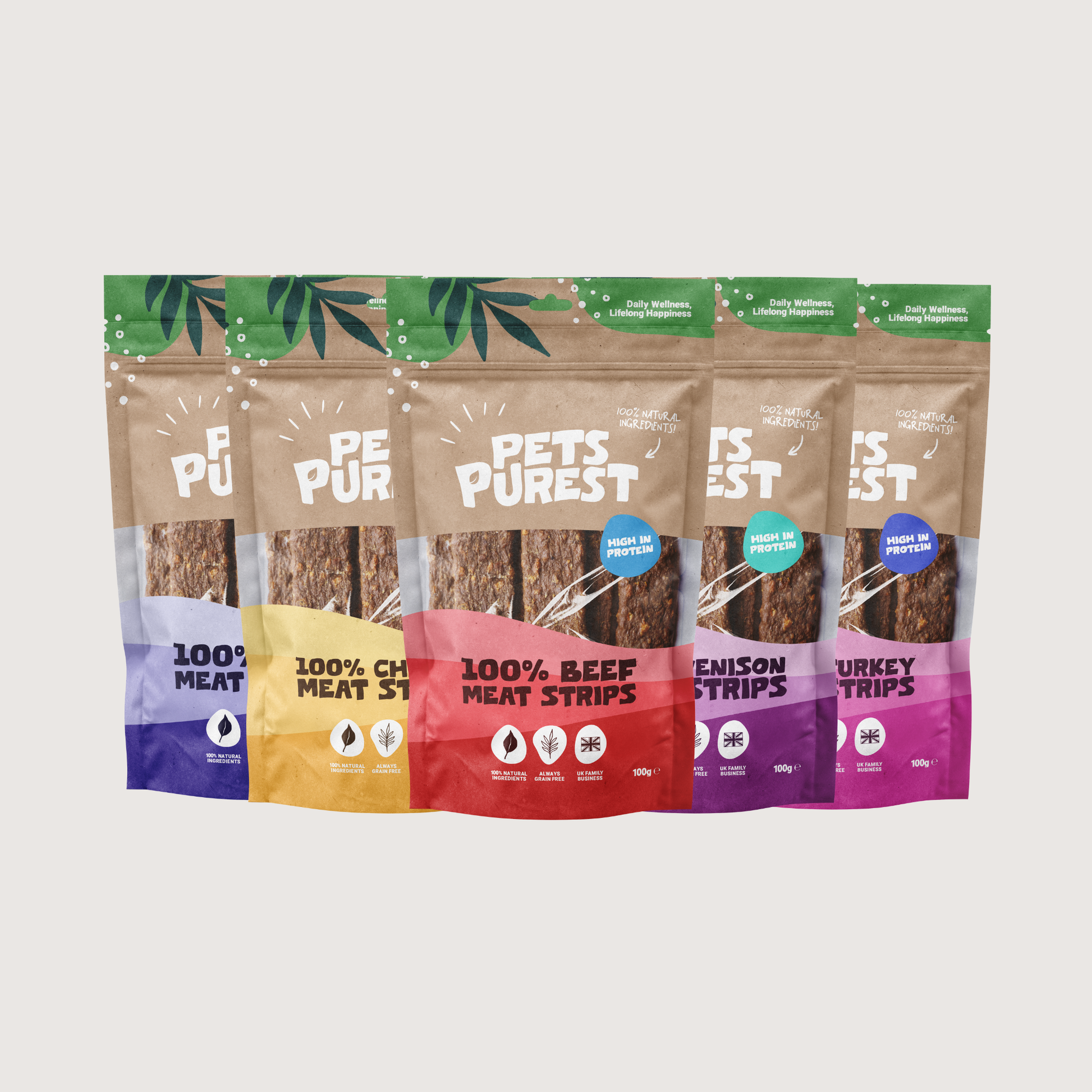 This bundle includes one of each of our 100% Natural Meaty Strips: Chicken, Beef, Duck, Turkey, and Venison.